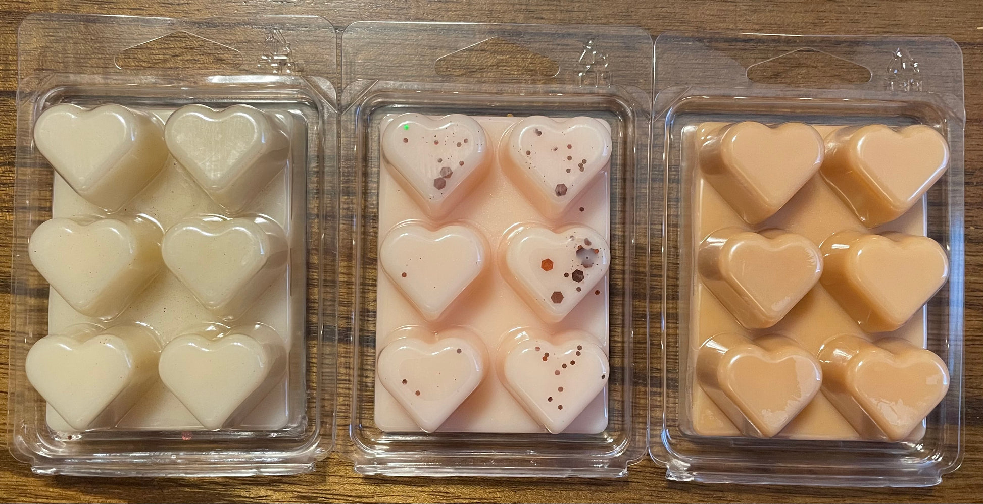 Clams with six heart shaped breakaway scented wax melts. Average approximate net weight of 1.9 - 2.4 oz. Exact weight and wax type may vary.